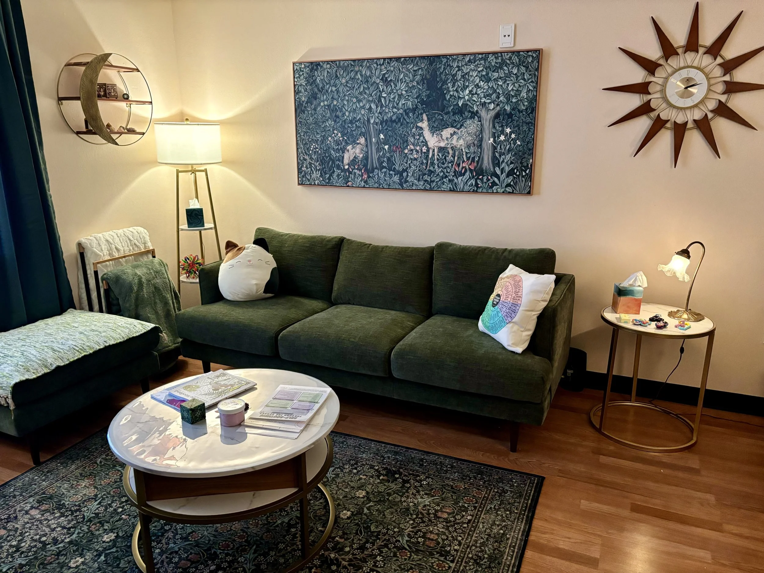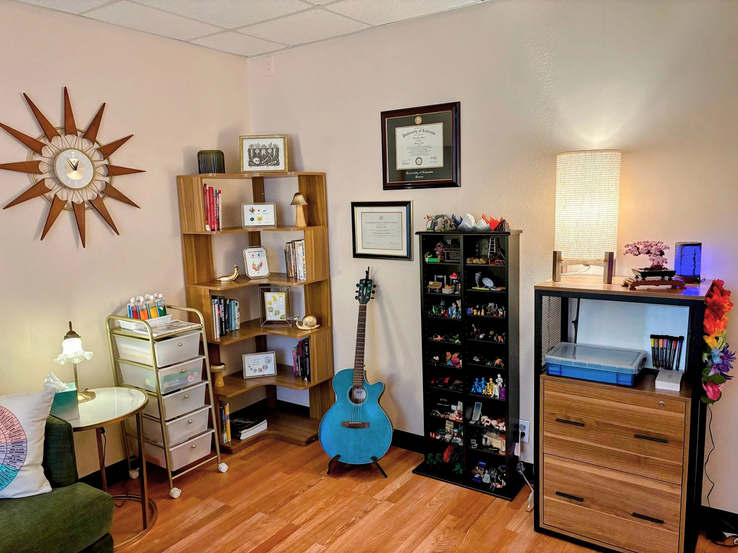 The office has a small, portable sandtray, miniatures for the sandtray, an art cart with many different types of supplies (acrylic and watercolor paint, markers, crayons, collage materials, polymer clay, oil and chalk pastels, etc.), a guitar, and an assortment of Tarot/oracle cards for clients to use. Clients are welcome to make themselves feel more comfortable by propping their feet up on the ottoman and grabbing a fuzzy or weighted blanket.